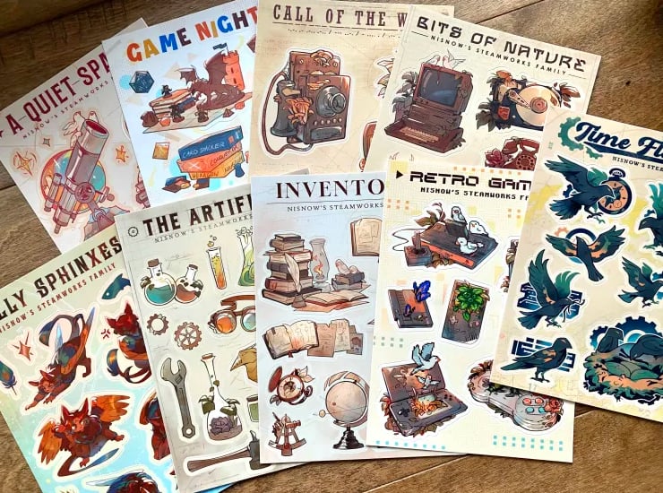 Nine detailed sticker sheets of cool tech, nature, and books with a steampunk/solarpunk vibe! Great for journalling, scrapbooking, decorating tabletop roleplaying game character sheets, or showing off your love for this niche genre!